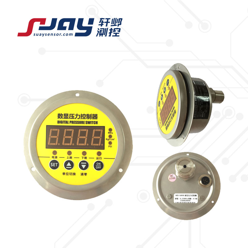 SUAY80压力控制开关是一款高精度智能型数字压力表,内置高精度压力传感器,能够准确的实时显示压力,并且具有精度高、长期稳定性好的特点。配备5位显示的大尺寸LCD液晶显示,具有清零、背光、开关机、单位切换、低电压报警、峰值记录等多种功能,操作简单,安装方便。壳体和接头采用304不锈钢,抗震性好,能够测量气体、液体、油等对不锈钢无腐蚀的介质。用3节5号电池供电,也可以采用USB供电,续航功耗低、时间长,适用于便携式压力测量、设备配套、校验设备等压力测量领域。
